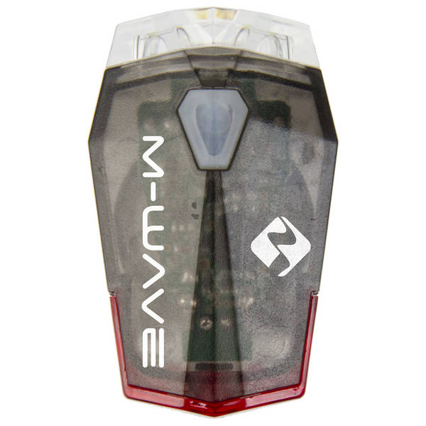 2 in 1 LED-Akku-Lampe M-WAVE, 2 weiße LED vorn / 1 rote LED hinten, 8 Funktionen, schwarzes Gehäuse, incl. Klettbandhalter, Lithium Polymer Akku, USB-Ladekabel, ohne Prüfzeichen, AM-Verpackung
